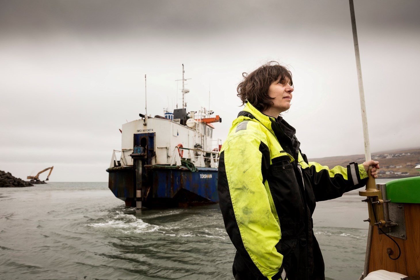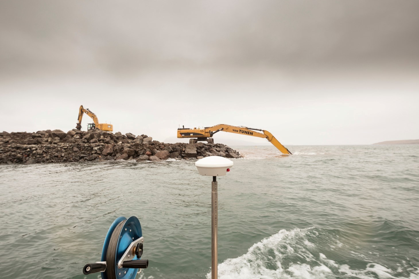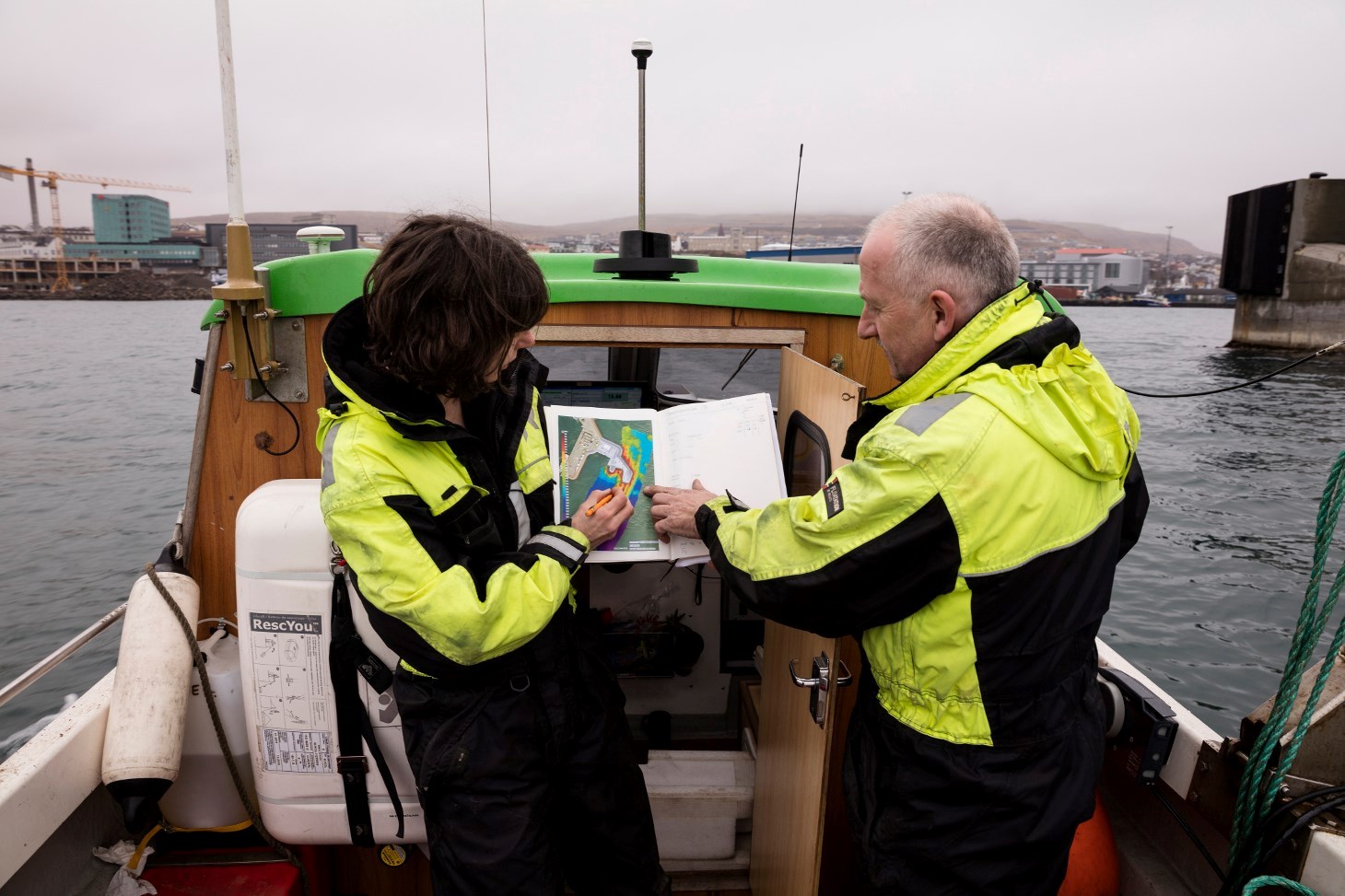Hendan dagin myndamaður okkara var umborð, gjørdu tey uppmátingar í sambandi við útbyggingini av Tórshavnar havn, Skansabryggjuni. Hesar uppmátingar av arbeiðsøkinum verða máldar eina ferð um mánaðin, so neyvt ber til at fylgja útleggingini av gróti.